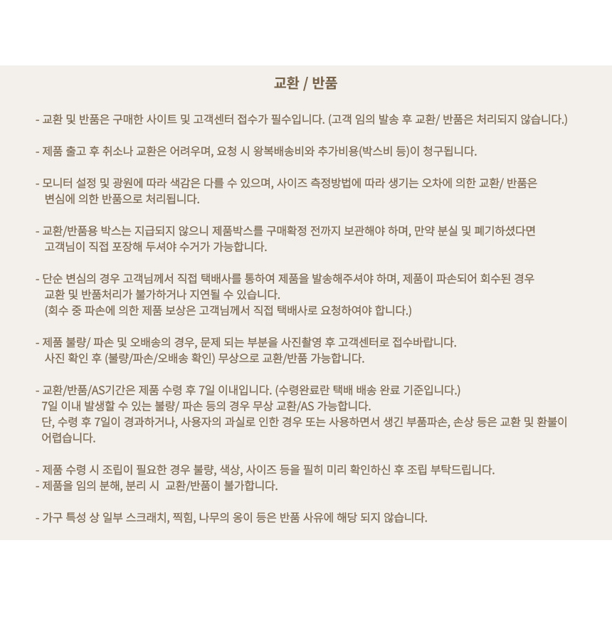 - - 교환/반품 안내: 고객변심 및 주문착오에 의한 교환/반품은 제품 수령일로부터 7일 이내 가능합니다.
