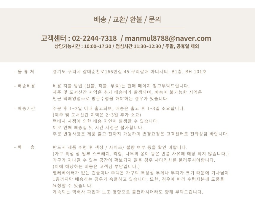 - - 배송안내: 전국 배송이 가능하며, 토요일과 공휴일을 제외하고 평균 2~5일 소요됩니다.