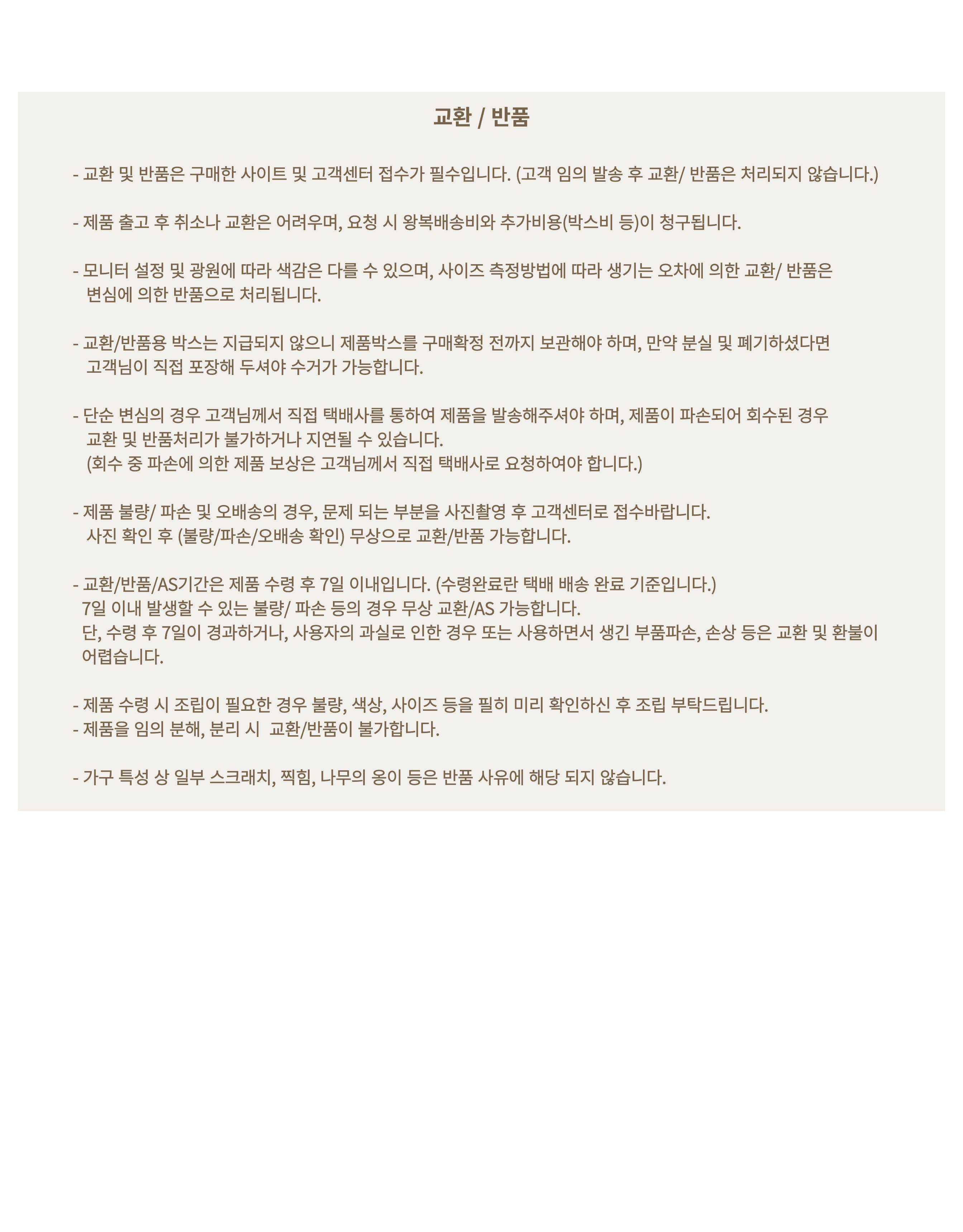 - - 교환/반품 안내: 고객변심 및 주문착오에 의한 교환/반품은 제품 수령일로부터 7일 이내 가능합니다.