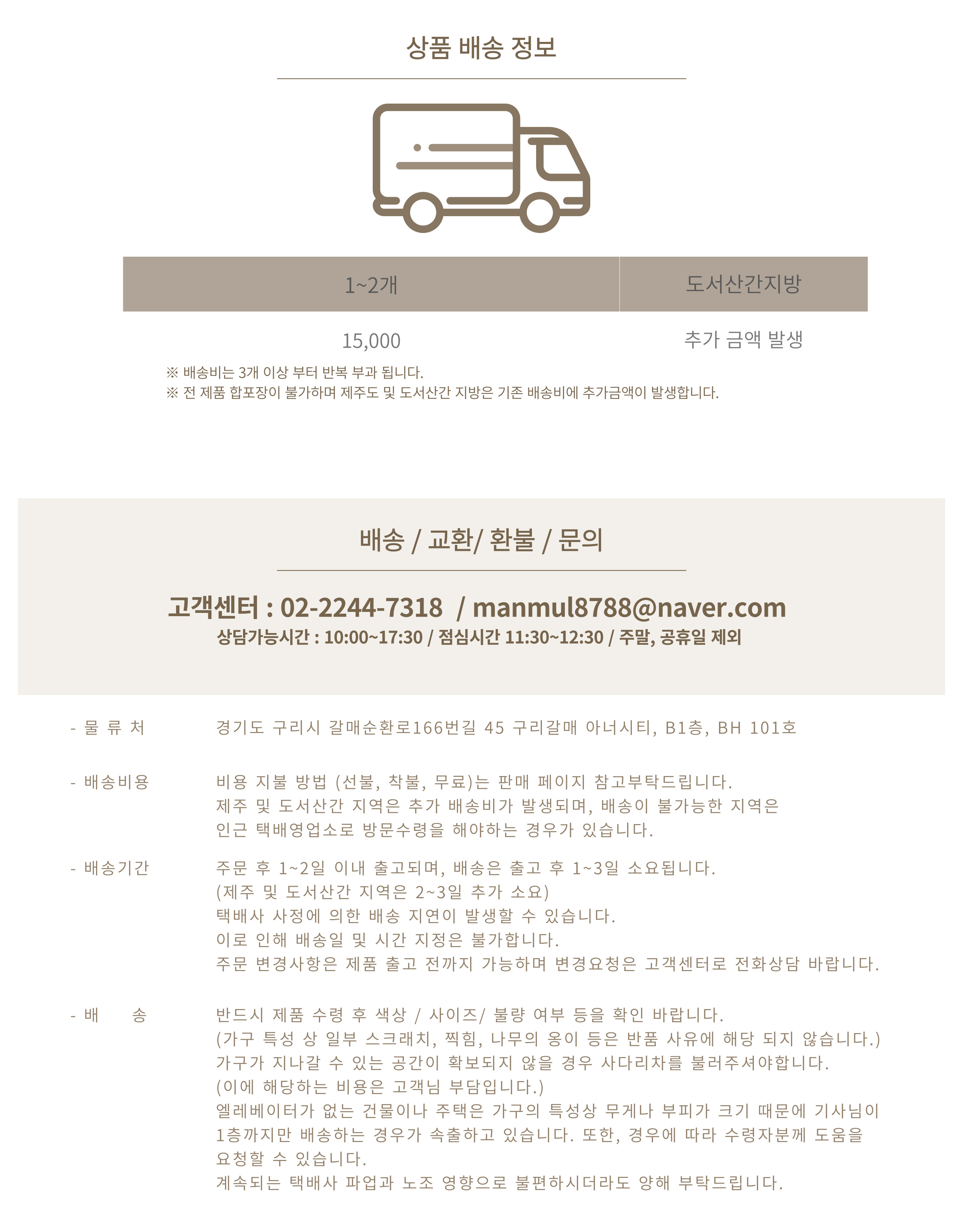 - - 배송안내: 전국 배송이 가능하며, 토요일과 공휴일을 제외하고 평균 2~5일 소요됩니다.